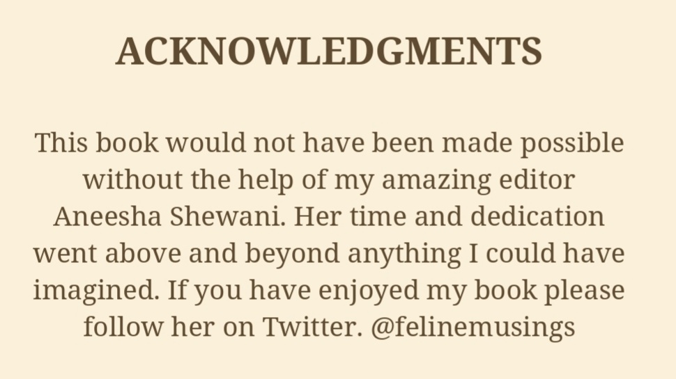 This book would not have been made possible without the help of my amazing editor Aneesha Shewani. Her time and dedication went above and beyond anything I could have imagined. If you have enjoyed my book please follow her on Twitter @felinemusings