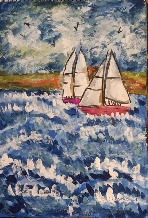 I reached out to Joyashree and shared how beautiful the artwork was and the words I had written. As we chatted, I got to see another brilliant piece on the theme of boats and stormy skies by Shreyan. It was touching.