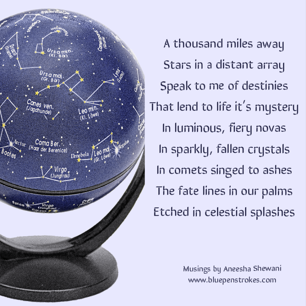 A thousand miles away Stars in a distant array Speak to me of destinies That lend to life it’s mystery In luminous, fiery novas In sparkly, fallen crystals In comets singed to ashes The fate lines in our palms Etched in celestial splashes