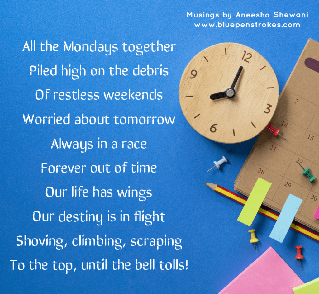 All the Mondays together Piled high on the debris Of restless weekends Worried about tomorrow Always in a race Forever out of time Our life has wings Our destiny is in flight Shoving, climbing, scraping To the top, until the bell tolls!