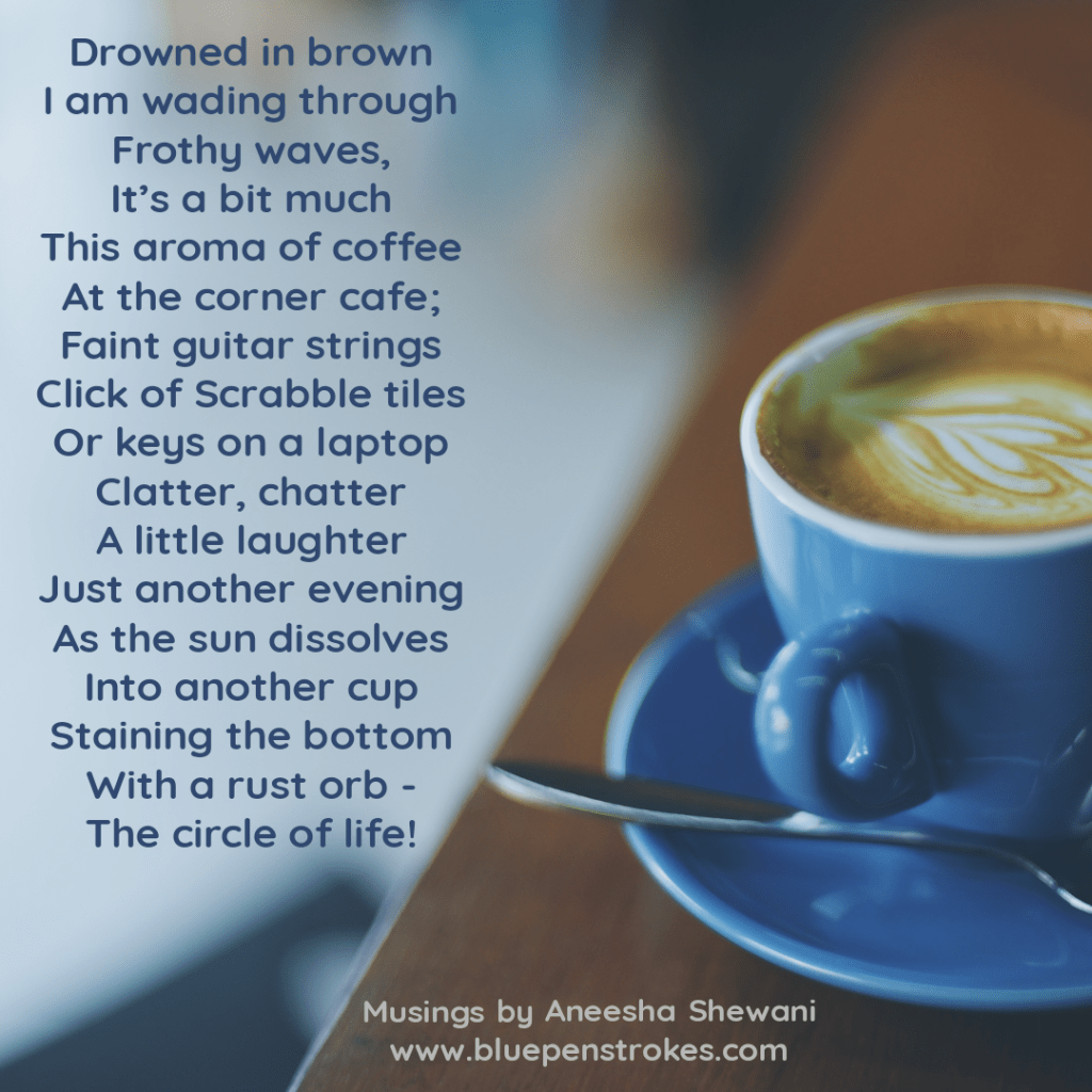 Drowned in brown I am wading through Frothy waves, It’s a bit much This aroma of coffee At the corner cafe; Faint guitar strings Click of Scrabble tiles Or keys on a laptop Clatter, chatter A little laughter Just another evening As the sun dissolves Into another cup Staining the bottom With a rust orb – The circle of life!