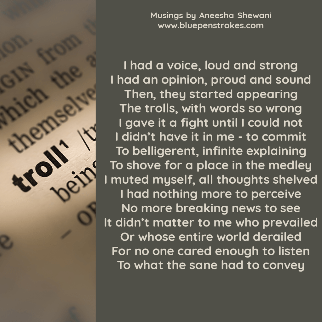 Needless to say, even these people must be relieved to have me exit from the group because now no one could challenge their point of view. We all love to believe we are right and our ideology is the best. Fair enough, but then why troll and abuse diverse ideologies. At that point in time, I wrote Trolled into Silence.