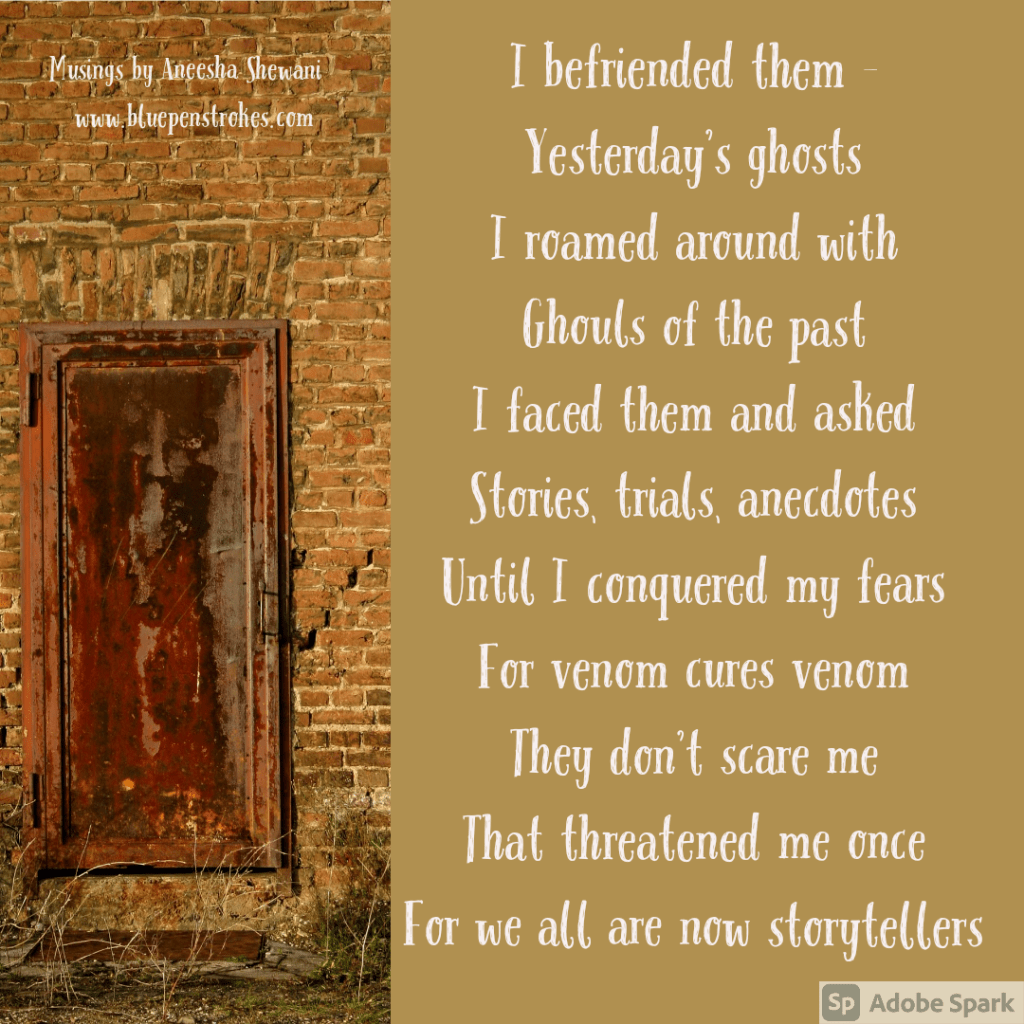 I befriended them – Yesterday’s ghosts I roamed around with Ghouls of the past I faced them and asked Stories, trials, anecdotes Until I conquered my fears For venom cures venom They don’t petrify me That threatened me once For we all are now storytellers