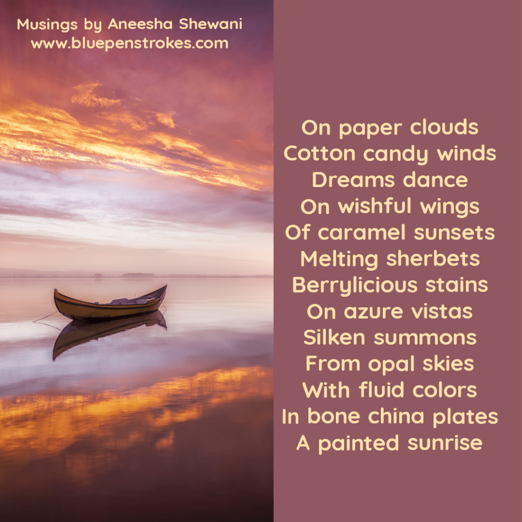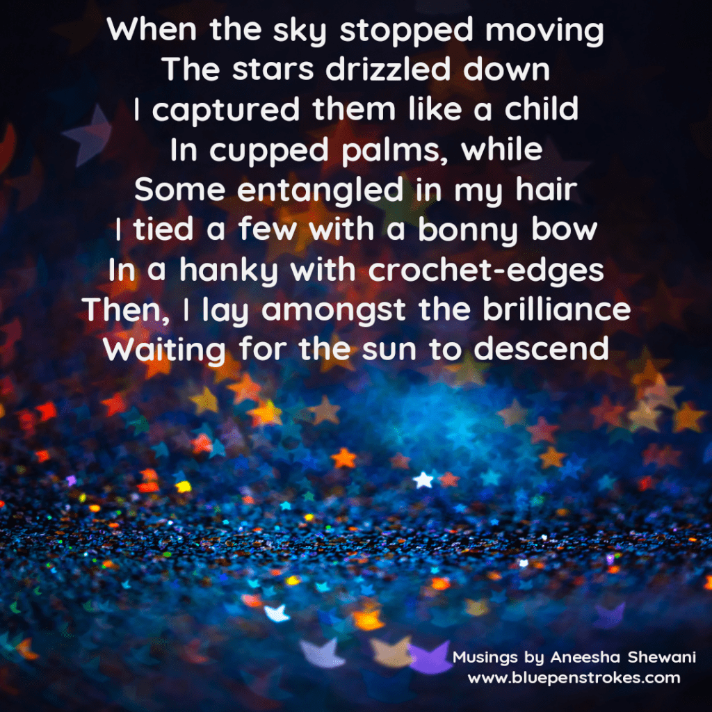 When the sky stopped moving The stars drizzled down I captured them like a child In cupped palms, while Some entangled in my hair I tied a few with a bonny bow In a hanky with crochet-edges Then, I lay amongst the brilliance Waiting for the sun to descend
